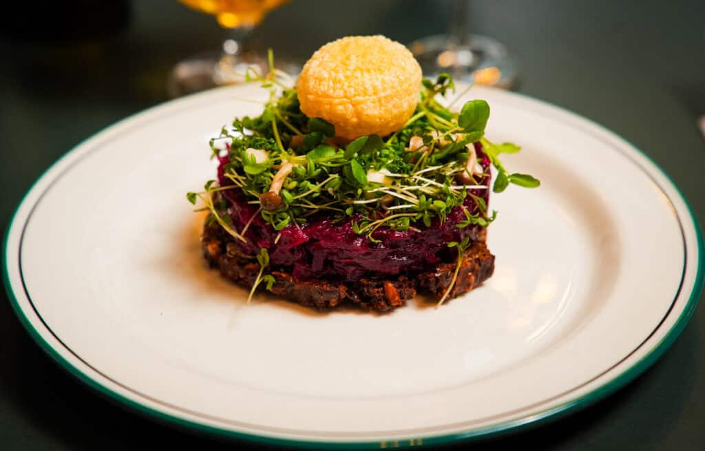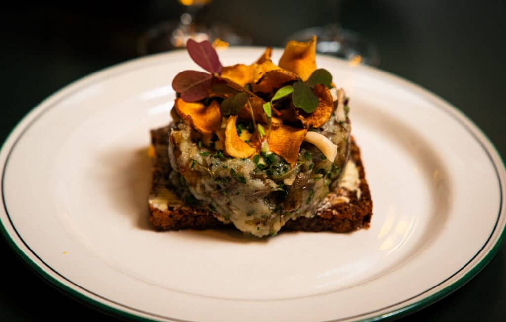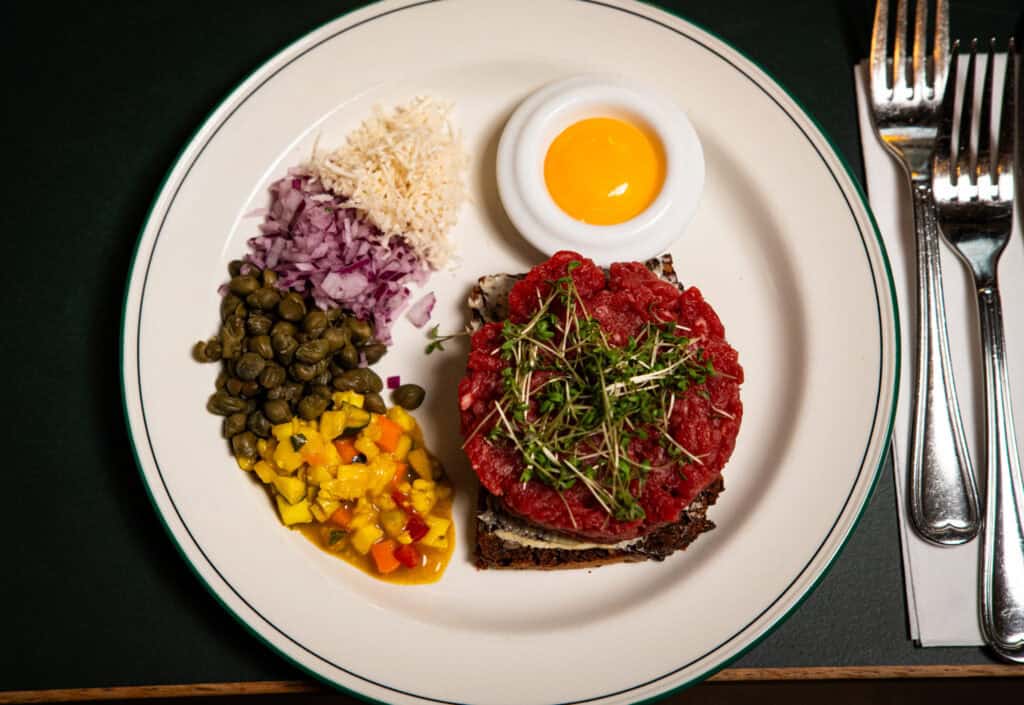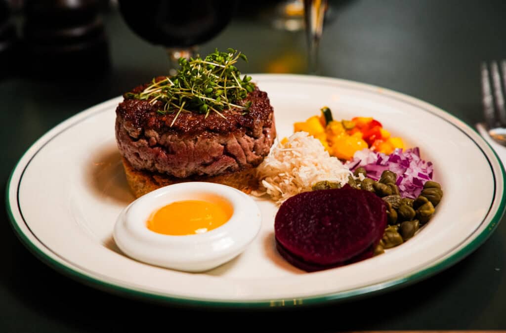 Lynstegt oksetatar serveres “rå” med hele molevitten ( kan også serveres gennemstegt)