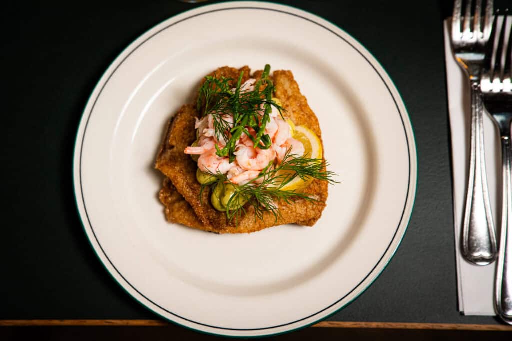 Smørstegt fiskefilet med søkogte rejer, dildmayonnaise og citron