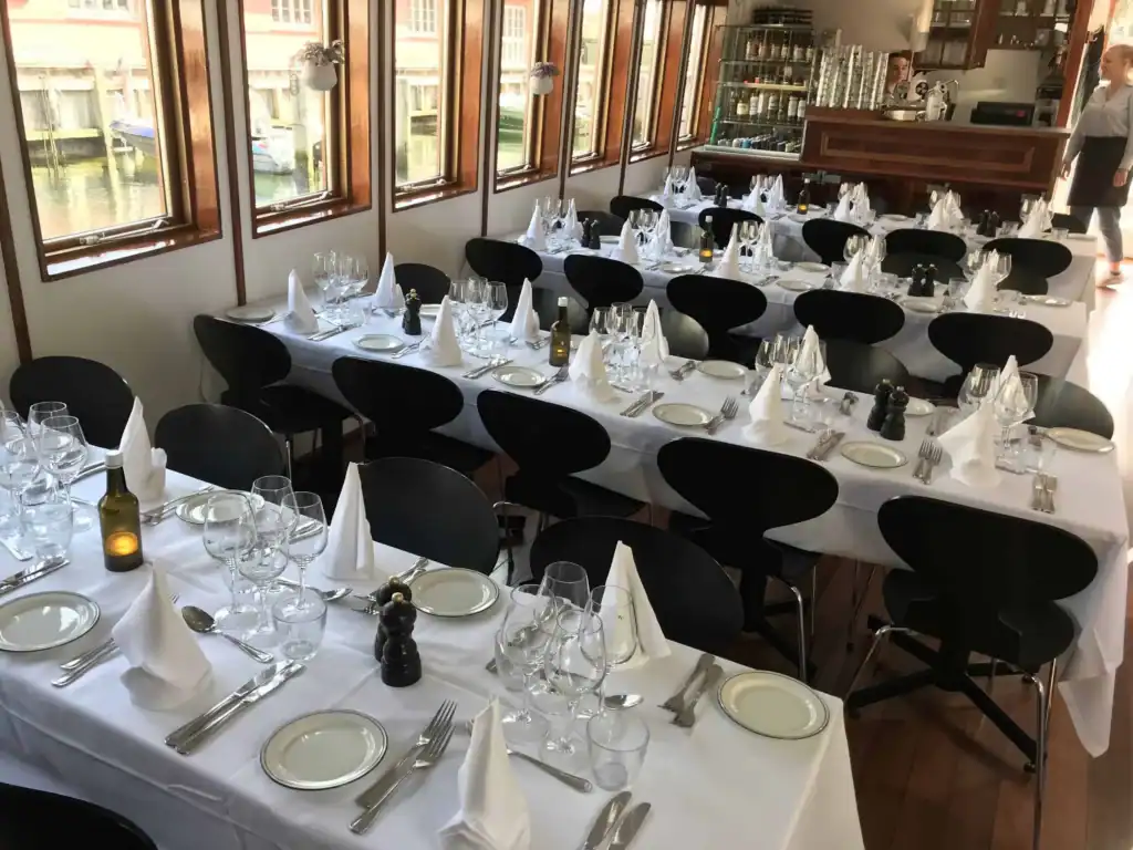 I krostuen har vi plads til 56 gæster. Krostuen har trægulve og glasloft – en rigtig autentisk og hyggeligt christianshavnerrestaurant med lidt hård akustik. Der er også mulighed for at sidde ombord på Christianshavnerfærgen – en restaureret svensk færge fra 1880 beliggende i kanalen lige uden for krostuen. Her kan der sidde op til 40 gæster i salonen med god akustik og egne toiletter.